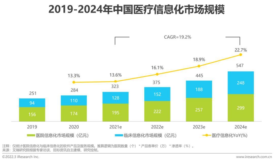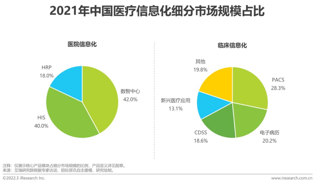 受政策和技术驱动,未来2-3年院端信息化建设需求将持续释放,核心软件市场规模保持稳定增长。据艾瑞建模测算,2021年中国医疗信息化核心软件市场规模为323亿元,2021-2024年复合增长率为19.2%,预计2024年市场规模达547亿元。聚焦细分领域,短期内医院信息化仍是厂商的主战场,三级以上医院对HRP、数智中心产品模块需求旺盛,三级以下医院对HIS系统、数智中心(尤其是集成平台)投入意愿增强,2021-2024年复合增长率为15.3%;临床信息化规模增速较快,三级医院对新兴医疗应用需求是拉动市场的核心引擎, 2021-2024年复合增长率为24.7%。