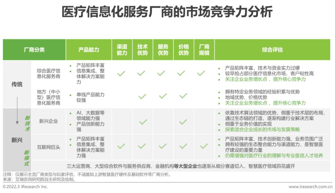 艾瑞基于商业模式/产品技术应用等维度将众多厂商类型分为传统与新兴两大类,其中传统医疗信息化服务商包括专注于医疗信息化领域的大型企业与具有地域性质的中小型企业,提供传统的IT业务,具备多年发展积累的产品经验、服务优势以及市场先发优势;新兴服务商包括跨界大型企业与技术创新型企业,一般通过模式创新与技术创新形成优势,提供医疗解决方案。此外,头部厂商多在营销运营能力、渠道能力、技术能力等层面具备一个或多个竞争优势。医疗信息化行业对安全、质量和稳定性非常重视,且客户粘性高,渠道、产品化能力以及整体解决方案交付能力是市场准入的核心壁垒。