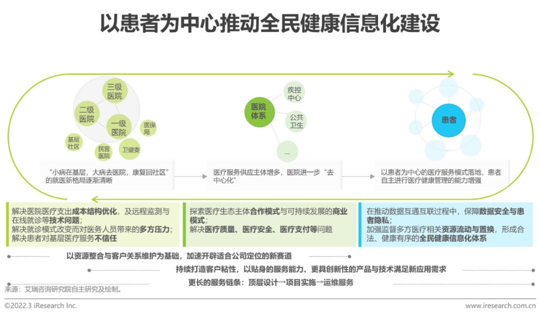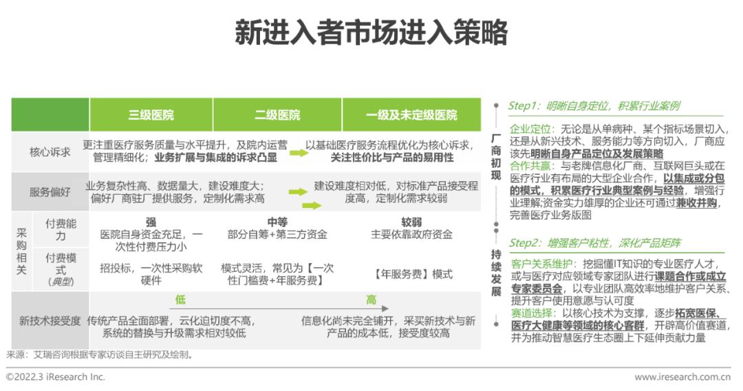 从现状看,由于传统医疗行业信息化市场厂商众多,市场集中度较低,新兴厂商具备市场进入的条件。然而政府与医院议价能力较强,且看重供应商既往案例及服务团队力量,倾向于与常年合作的供应商合作;新进入者也常由于缺乏成熟的合作模式、专业医疗专家合作,其产品与服务的专业性受到质疑。如何打破服务壁垒、技术壁垒,探索可持续发展的商业模式,高效转化客户,打开市场成为当下首要任务。艾瑞认为新进入者应当面向不同类型客户、灵活地分阶段调整市场策略,具体而言,在传统医疗信息化的赛道上,一方面新进入者可以通过与老牌厂商合作进入市场,基于技术与资源置换,在获得服务经验与行业理解的同时,让思维较为固化的客户切身体会产品效能,提升品牌口碑,保障企业增长;另一方面从企业自身出发,明晰产品定位,技术、服务(尤其是人才)“多手抓”。此外,无论是新兴医疗市场,还是全民健康建设都处于起步阶段,新进入者也可提前布局这部分市场,提升市场地位与核心竞争力。