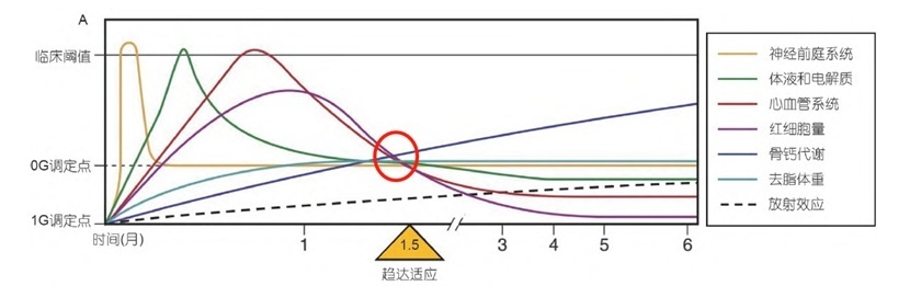 如图2可以看出,人体各个系统会在微重力环境中约一个半月的时候达到稳态,这就是说人体在太空中重新建立起了微弱的平衡。