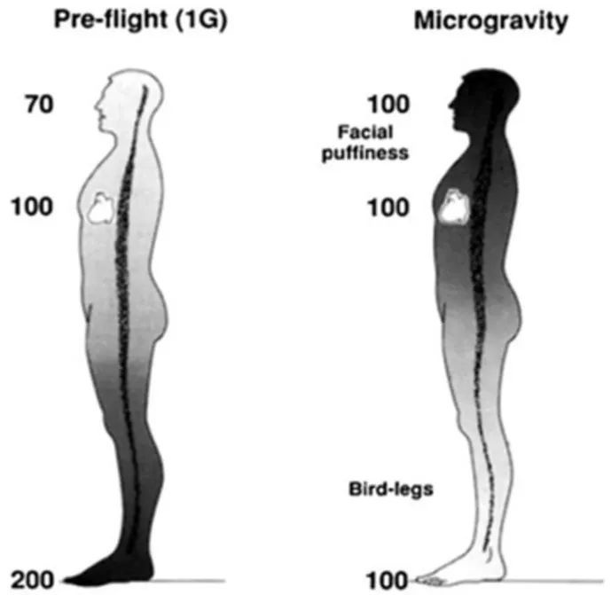 一、下肢和腹部的体液向中央和头部转移, 约有2L的体液从下半身转移至上半身; 这会使得航天员面部充血变肿,给人一种上了太空后仿佛发福了一般,俗称“月亮脸”。