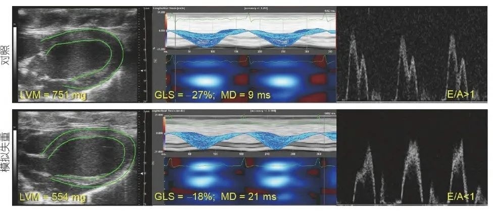 中国学者发现在模拟鼠中失重4周即可引起心肌质量减少、心肌应变(收缩功能)下降、心脏舒张功能降低(二尖瓣舒张早期/晚期血流速度比值E/A<1) 且右心和左心呈现不同程度的重塑和恢复速度。