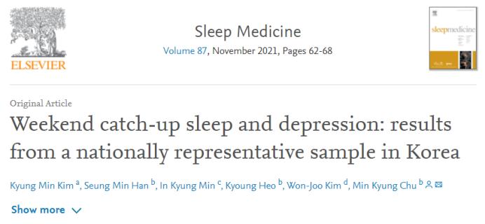 这项研究于2021年发表在Sleep Medicine(睡眠医学)期刊上,文章名为“Weekend catch-up sleep and depression: results from a nationally representative sample in Korea”,中文译作“周末补觉和抑郁症:来自韩国全国代表性样本的结果”。研究团队来自韩国延世大学医学院。