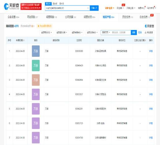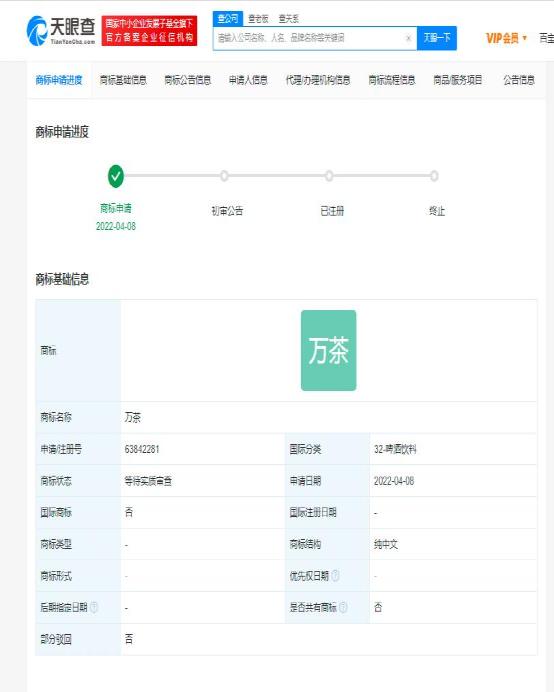 天眼查App显示,近日,大连万达集团股份有限公司申请注册多个“万茶”商标,国际分类包括啤酒饮料、方便食品、厨房洁具等,目前商标状态均为等待实质审查。