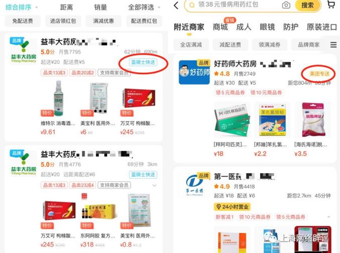 建议市民可以首先尝试登录美团、饿了么、京东到家等外卖配送App的“买药”分区,搜索相关药品后,App会显示附近正在营业的药店中是否有库存,如有库存即可下单购买,并由骑手接单取货后送到小区门口。如果是处方药平台还会跳转在线问诊,由互联网医生问诊后帮忙开具互联网药方。