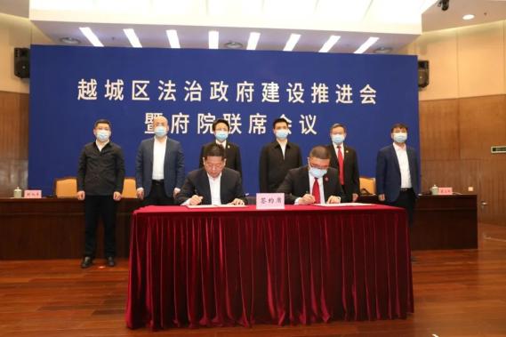 会上,越城区政府与越城区法院签订了《合力创建全国法治政府建设示范区协议》,双方将共同合力高质量按照《市县法治政府建设示范指标体系》全面开展创建活动。市中院党组书记、院长姚海涛,钱林江区长共同见证协议签署并讲话。