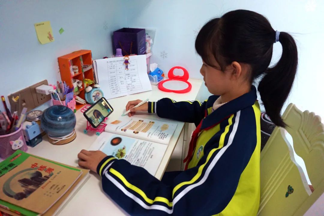 翁源县实验小学六年级学生王梓璇在家中接受线上授课。