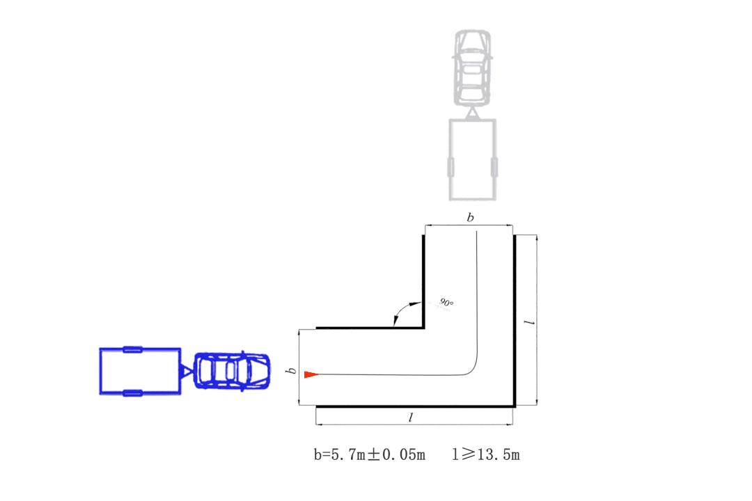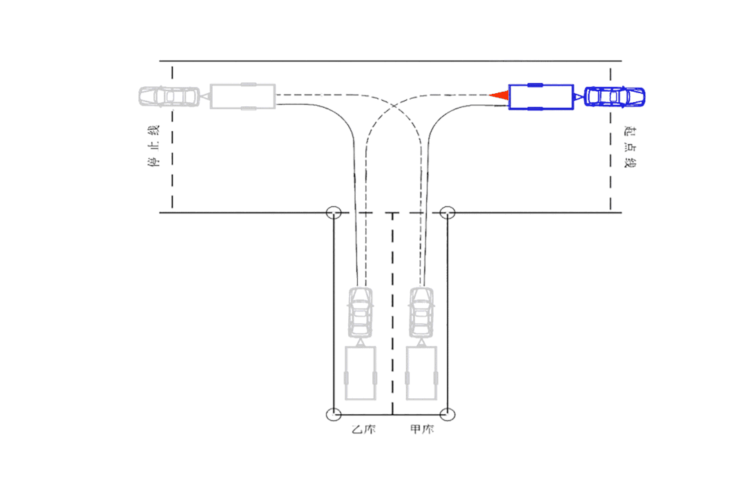 从起点线(两个前轮触地点在起点线以外)倒入乙库停正,随后前进出库向停止线行驶,待两个前轮触地点均驶过停止线后,倒入甲库停正,前进返回起点线。考试过程中,不应碰擦桩杆,车身不应超出道路边缘线或库位边线,入库停止后车身不应超出控制线;每次倒车过程中两个前轮触地点驶过库口控制线前允许改变行驶方向调整入库角度。项目完成时间不应超过 8分钟。
