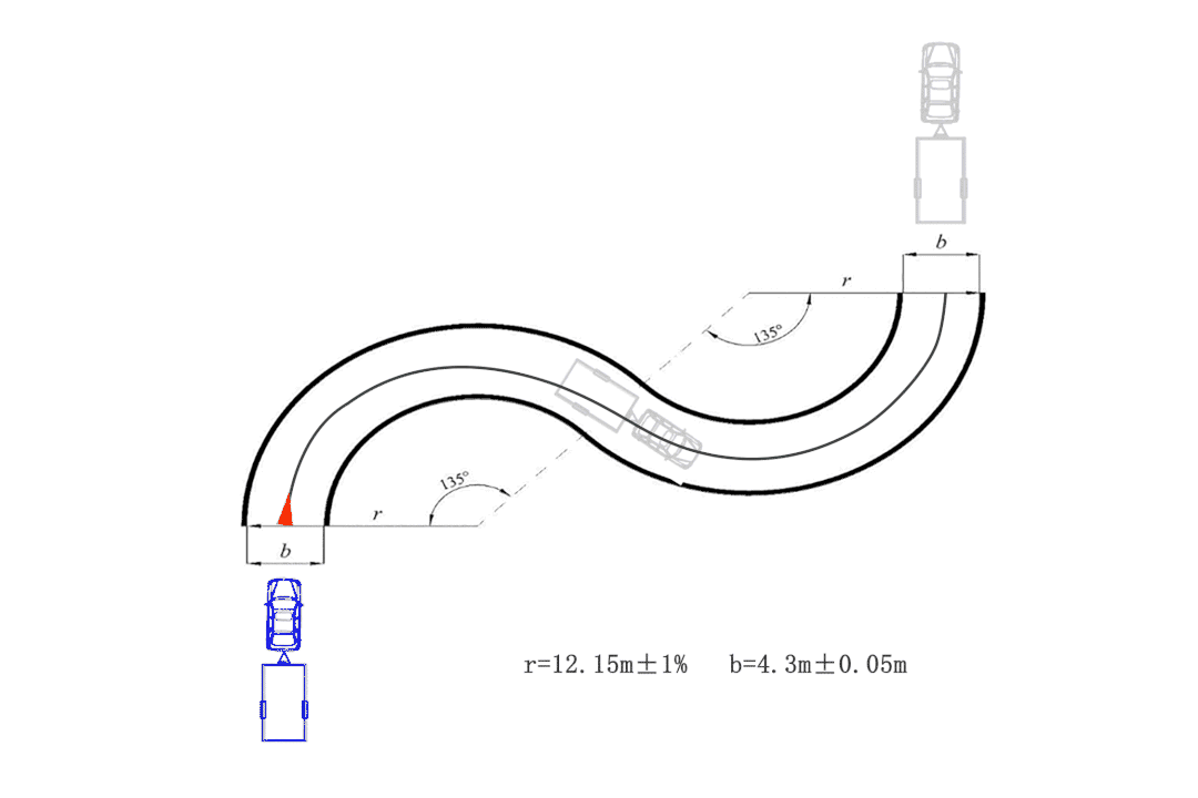 驾驶车辆从弯道的一端前进驶入,从另一端驶出。行驶中,车轮不应触轧车道边线,转向、速度应平稳,中途不应停车。