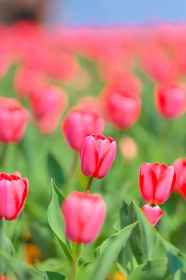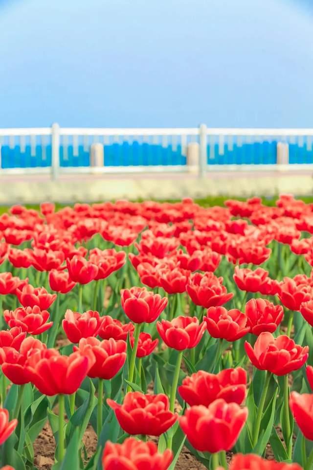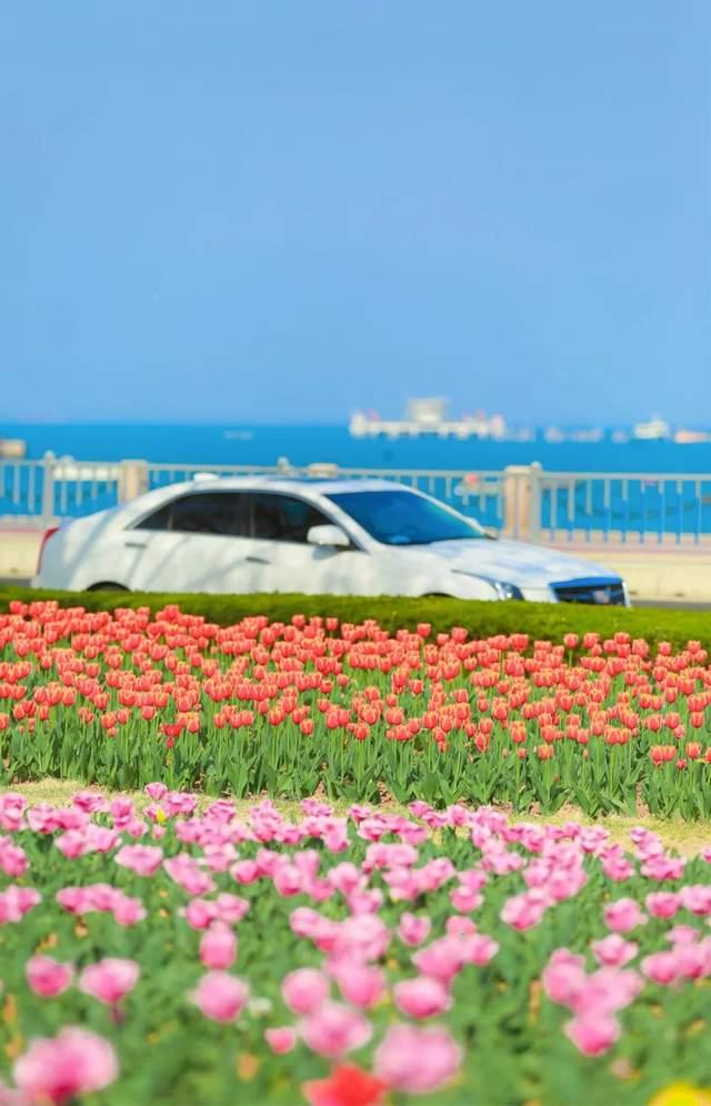 在海风的吹拂下,一朵朵娇艳欲滴、色彩斑斓的郁金香在风中轻盈舞动,营造出专属于春日的浪漫氛围,撩拨游客心神。