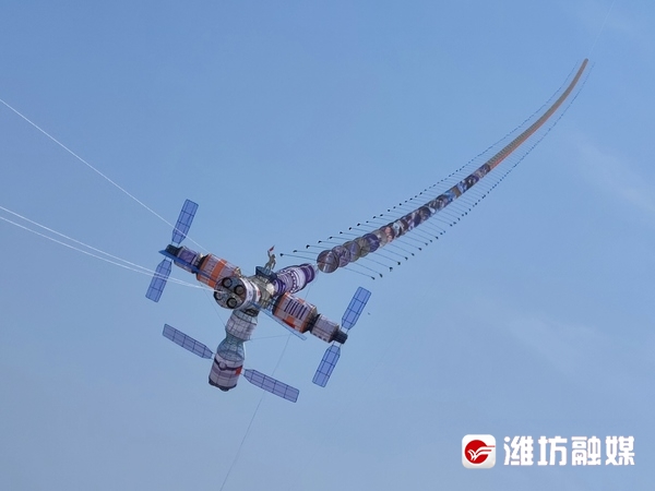 4月17日,在潍坊滨海国际放飞场,一只“中国空间站”主题风筝冉冉升起,庆贺宇航员胜利归来。这只风筝总长160米,主题空间宽3.5米,高度3.5米,由潍坊传统风筝第四代传承人刘志江和20余位风筝艺人历时两个月完成。该风筝把潍坊风筝传统扎制技艺与现代数字技术相结合,还原了神州飞船与天宫号对接和宇航员出舱太空行走的景象,表达了潍坊人民对祖国成为航天强国的祝福。