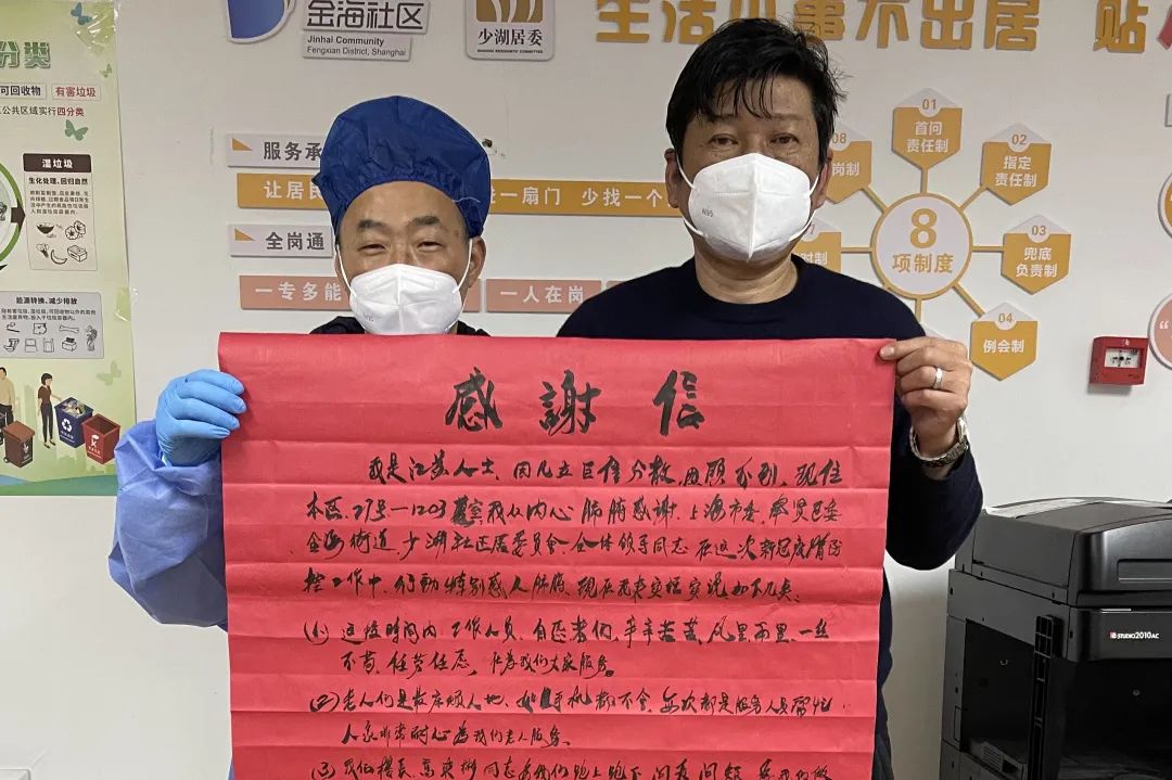 江苏籍小区居民送给居委一封诚恳的亲笔信,高度肯定了工作人员们的付出。来自外地的他们也同样感受到了本地的“守护”。