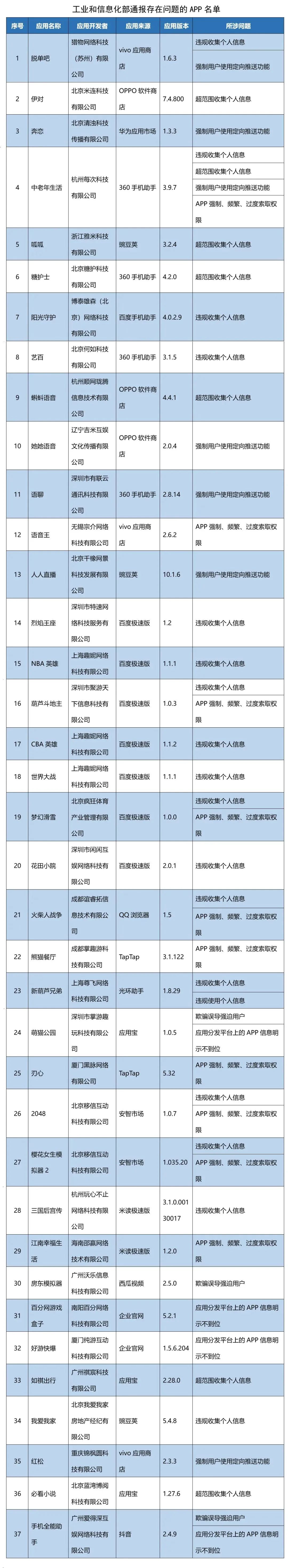 依据《个人信息保护法》《网络安全法》《电信条例》《电信和互联网用户个人信息保护规定》等法律法规,我部近期组织第三方检测机构对移动互联网应用程序(APP)进行检查。截至目前,尚有37款APP未完成整改(详见附件)。