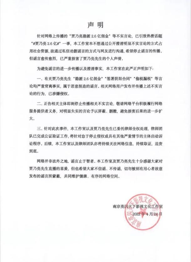 4月24日,贾乃亮工作室发表声明辟谣近日网络不实言论,声明称,有关贾乃亮“隐匿2.6亿佣金”、“签署阴阳合同”、“偷税漏税”等言论均严重背离事实,属于恶意捏造的谣言。同时正告相关主体及平台对失实言论进行删除、屏蔽。声明指出律师团队已完成公证取证工作,将启动诉讼程序,追责到底。