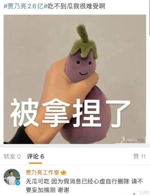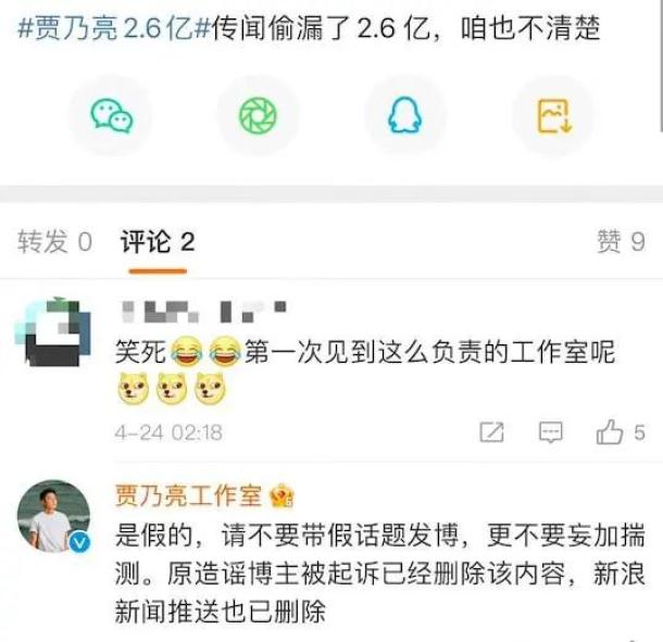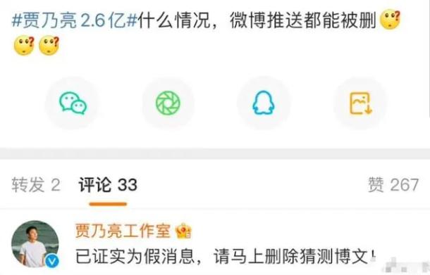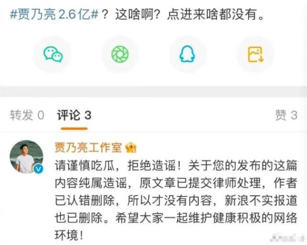 该话题引发热议后,贾乃亮工作室第一时间联系相关主体删除不实报道,并开始在网友发布的“贾乃亮2.6亿”微博下留言辟谣。