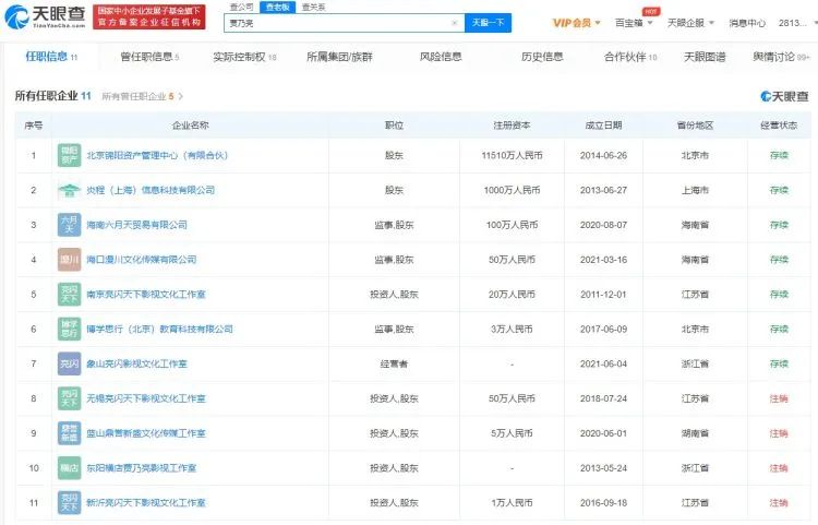 天眼查App显示,贾乃亮名下关联企业共有11家,其中7家为存续状态,包括南京亮闪天下影视文化工作室、象山亮闪影视文化工作室2家个人工作室及5家持股公司,投资版图涉及文化传媒、资产管理、教育科技、贸易等领域。