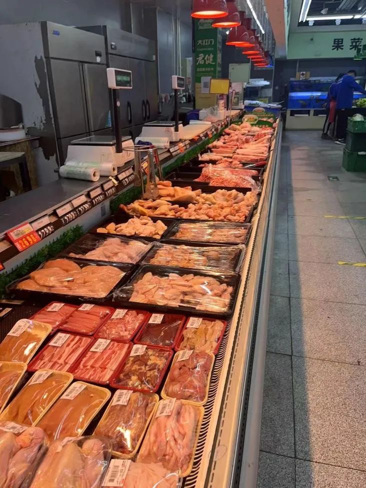 朝阳区京客隆针织路超市肉类品摆放的满满当当 李宁/摄