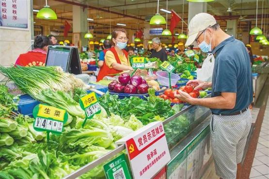 在海口市龙华区文华农贸市场,市民在党员示范摊位上购买蔬菜。海南日报记者 袁琛 摄