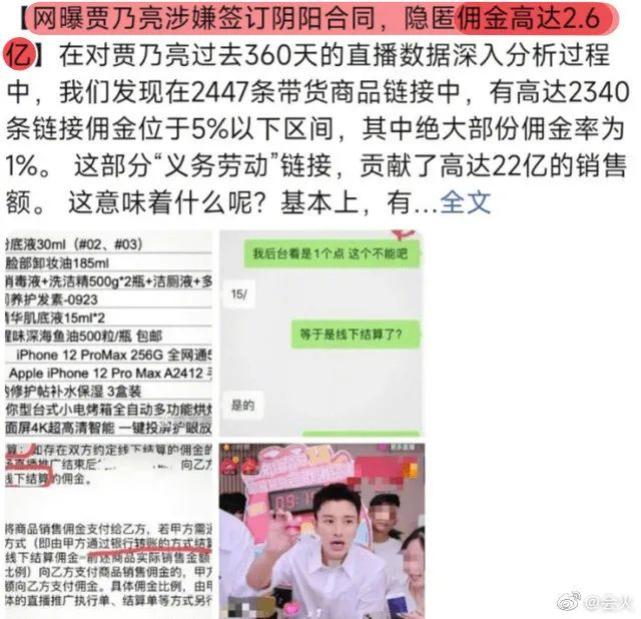 此前,网友发文称:通过对贾乃亮过去360天的直播数据进行深入分析,发现在2447条带货商品链接中,有高达2340条的佣金位于5%以下区间,其中绝大部分佣金率为1%,而这些“义务劳动”链接,贡献了高达22亿的销售额。