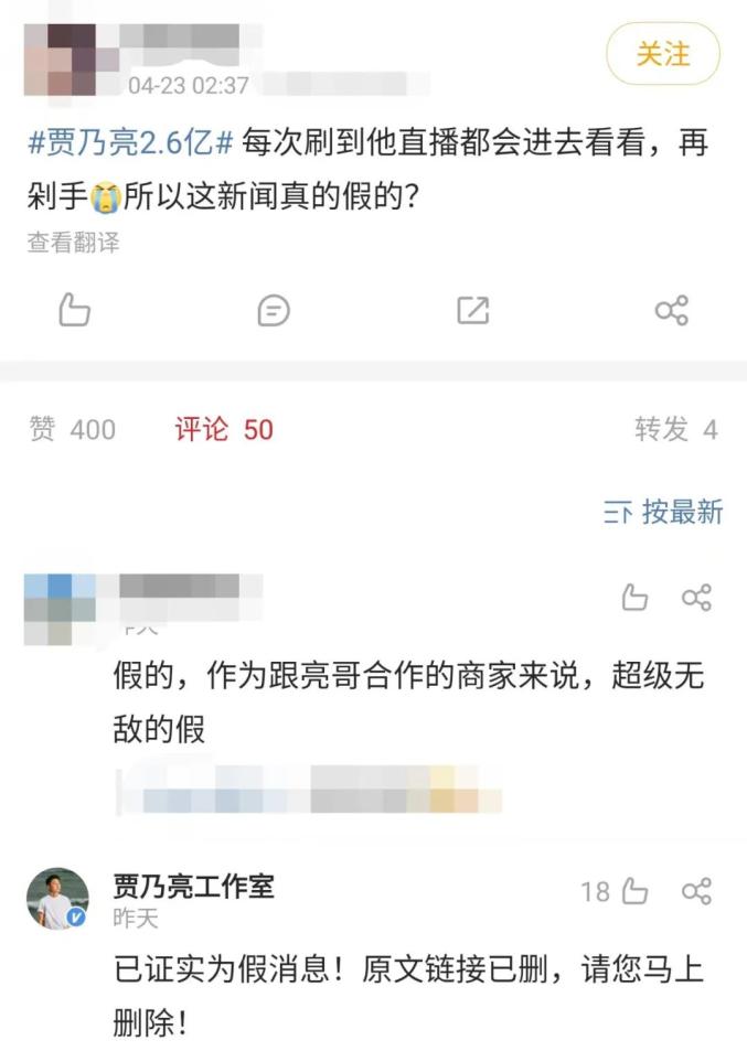 23日到24日凌晨,贾乃亮工作室在多位网友微博下留言称“已证实为假消息”,“原造谣博主被起诉已经删除该内容,新浪新闻推送因为是假新闻所以也已删除”,同时要求网友们删除相关微博。