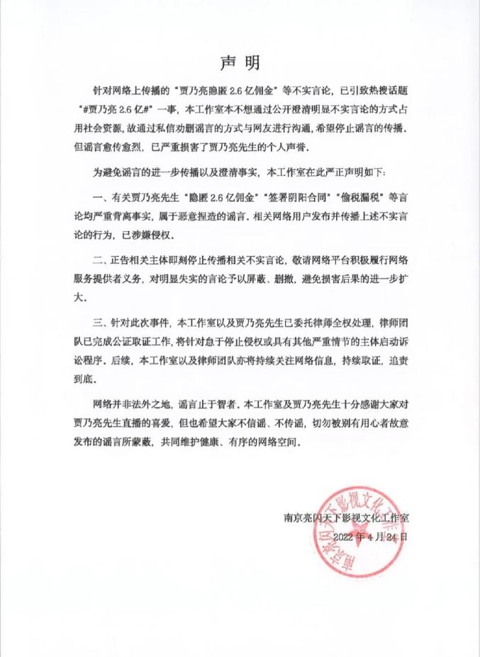 有关贾乃亮先生“隐匿2.6亿佣金”“签署阴阳合同”“偷税漏税”等言论均严重背离事实,属于恶意捏造的谣言。相关网络用户发布并传播上述不实言论的行为,已涉嫌侵权。