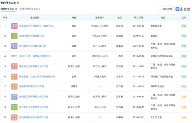 资料显示,贾乃亮共关联11家企业,其中7家为存续状态,包括南京亮闪天下影视文化工作室、象山亮闪影视文化工作室2家个人工作室及5家持股公司,投资版图涉及文化传媒、资产管理、教育科技、贸易等领域。