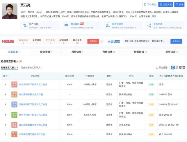 企查查信息显示,贾乃亮在6家企业(4家已注销)中担任法定代表人职务,关联企业涉及贸易、文化传媒、信息、影视、教育等领域。