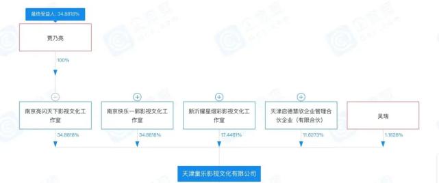 据悉,贾乃亮与经纪人郭红波共同创办了童乐影视,不过贾乃亮未直接持有关联公司天津童乐影视文化有限公司股份,而是通过南京亮闪天下影视文化工作室间接持股约34.88%。