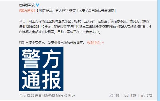 原标题:《【网络辟谣】网传“锦江区锦城逸景小区,枪战,五人死”为谣言!》