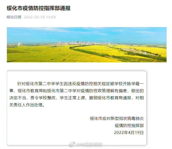 ☞绥化市回应学生因家长返绥未报备被开除。19日,绥化市疫情防控指挥部通报,针对绥化市第二中学学生因违反疫情防控相关规定被学校开除学籍一事,绥化市教育局和绥化市第二中学对疫情防控政策理解有偏差,做出的决定不当,责令学校整改、学生正常上课、撤销绥化市教育局通报,对相关责任人作出处理。(查看更多)☞陕西一拐婴团伙落网,主犯尚不满19岁。近日,陕西合阳警方抓捕4名涉嫌拐卖婴儿嫌疑人,其中主犯女子尚不满19周岁。4月初,经民警走访了解,合阳县金峪镇刘某于2019年前后涉嫌拐卖犯罪。在基本确定该犯罪团伙组织架构后,警方立即组织力量进行抓捕,成功打掉该犯罪团伙,破案2起。目前该案还在进一步侦办之中。(新浪新闻)