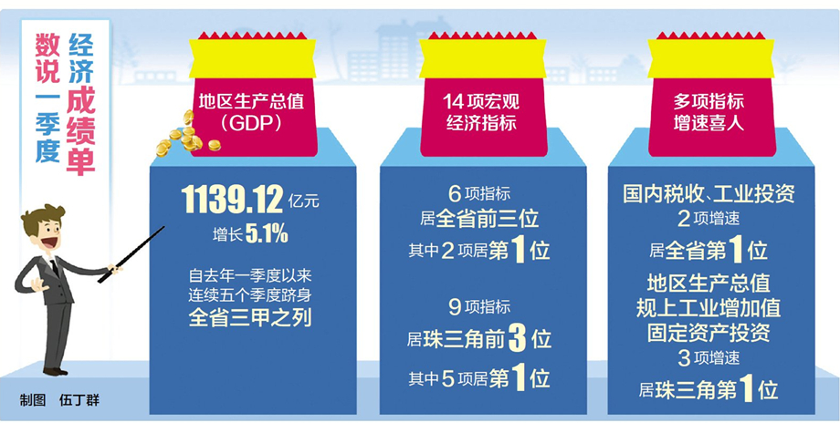 惠州一季度经济成绩单出炉:地区生产总值(GDP)1139.12亿元,增长5.1%,增速居珠三角第1位、全省第3位,是自去年一季度以来连续五个季度跻身全省三甲之列。14项宏观经济指标中,6项指标居全省前三位,其中2项居第1位;9项指标居珠三角前三位,其中5项居第1位。国内税收、工业投资增速居全省第1位;地区生产总值增速、规上工业增加值增速、固定资产投资3项增速都是珠三角第1位。
