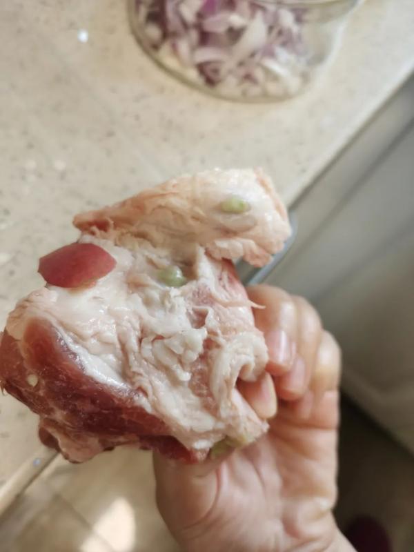 张林说,团购渠道是青浦区发布的居民生活物集采集配告知书上的麦德龙平台。该猪肉套餐售价80元,一共三包,大概有10个人团购,总价8000元左右。她吃了前两包后,还剩下一包放在冷冻里,近期拿出这包猪肉解冻切开时发现,里面一处有绿色脓液。“团这批猪肉的都是小区内部的人,价格和分量正常,但出现(脓液)这种情况实在太恶心了。”她说,希望平台能做好售后工作。