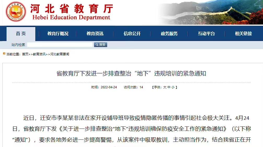 ● 河北排查整治地下违规培训,坚决查处“一对一”等“地下”违规培训。