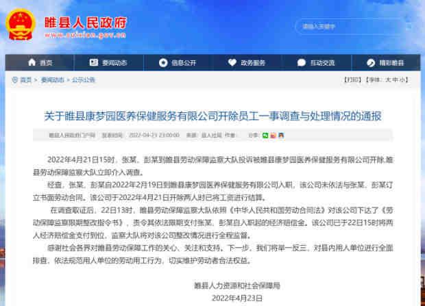 ● 女子称羡慕工资按时发被开除,河南睢县官方责令睢县康梦园医养保健服务有限公司赔偿整改。
