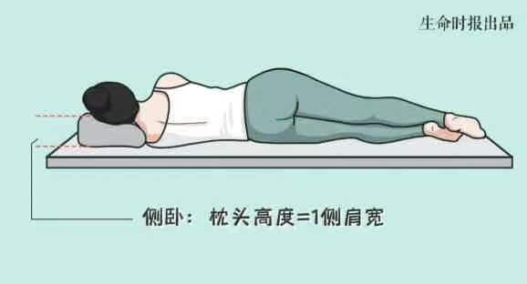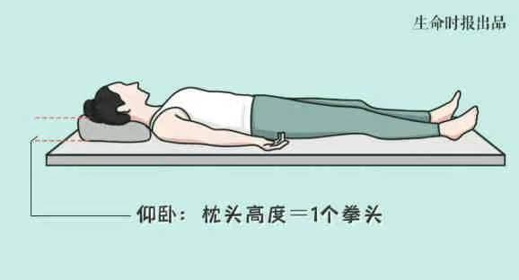 ● 从颈椎健康角度看,最佳睡眠姿势是仰卧,能最好地维持颈椎自然弧度。枕头太高,容易头晕缺氧;枕头太低,容易影响呼吸。①习惯仰睡:枕头高度应以压缩后与自己的拳头高度相等为宜,大概为8厘米。②习惯侧卧:枕头高度应以压缩后与自己的一侧肩宽高度一致为宜,约为15厘米。