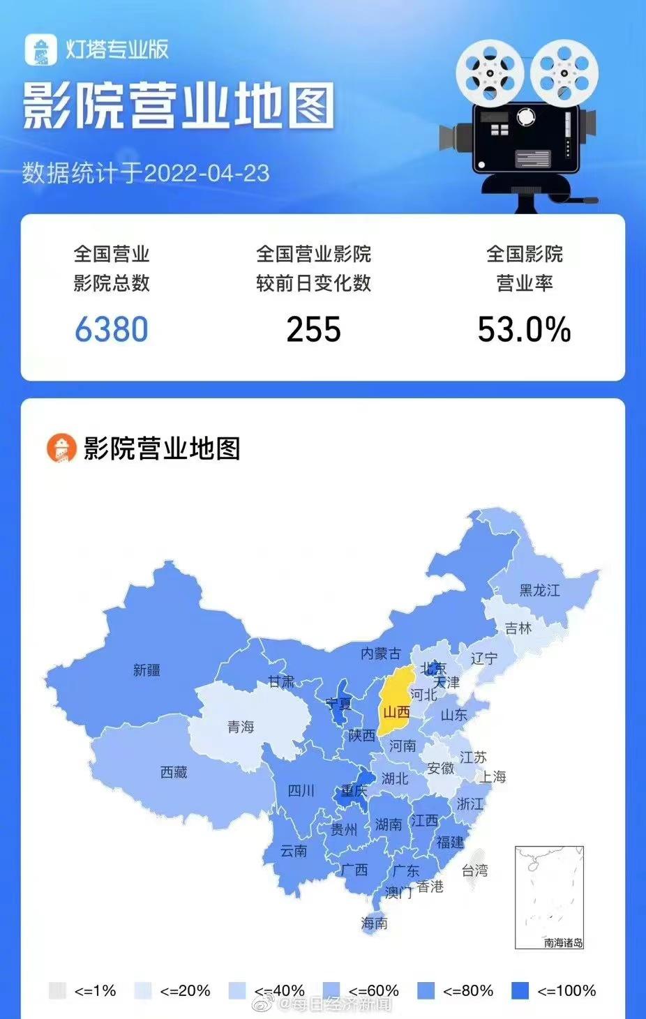 ● 4月23日全国影院营业率53%,营业影院6380家,较前日增加255家。