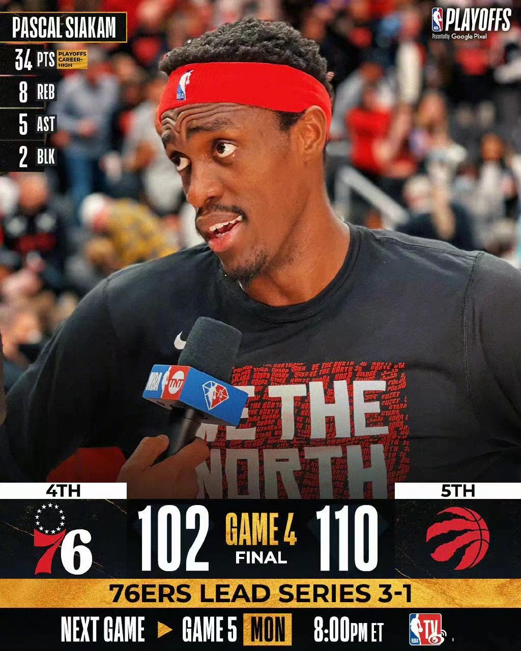 ● NBA季后赛:猛龙110-102战胜76人,系列赛大比分来到1-3。西亚卡姆本场比赛拿到34分8篮板、巴恩斯6分11篮板。