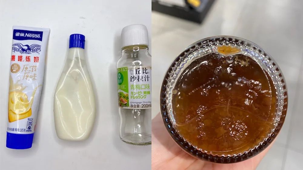 轻食西餐系列的搭配。雀巢炼奶有奶香、巧克力和草莓好几种口味,煮奶茶或者做甜品的时候加一点就很甜很提味。丘比的各种沙拉酱,直接涂面包或者拌菜就很好吃,沙拉汁系列更丰富,包装上写了什么口味就一定是什么口味。