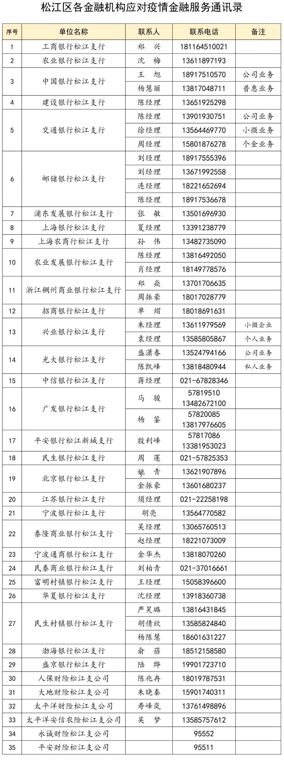 原标题:《驻松35家金融机构发布助企纾困政策,松江区支持企业应对疫情金融服务指南来啦!》