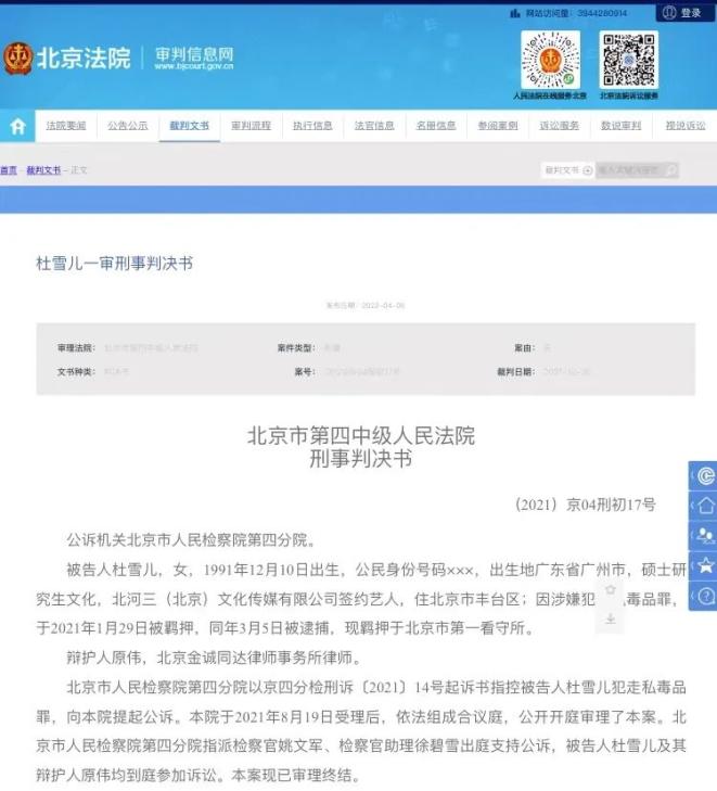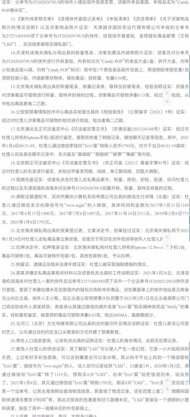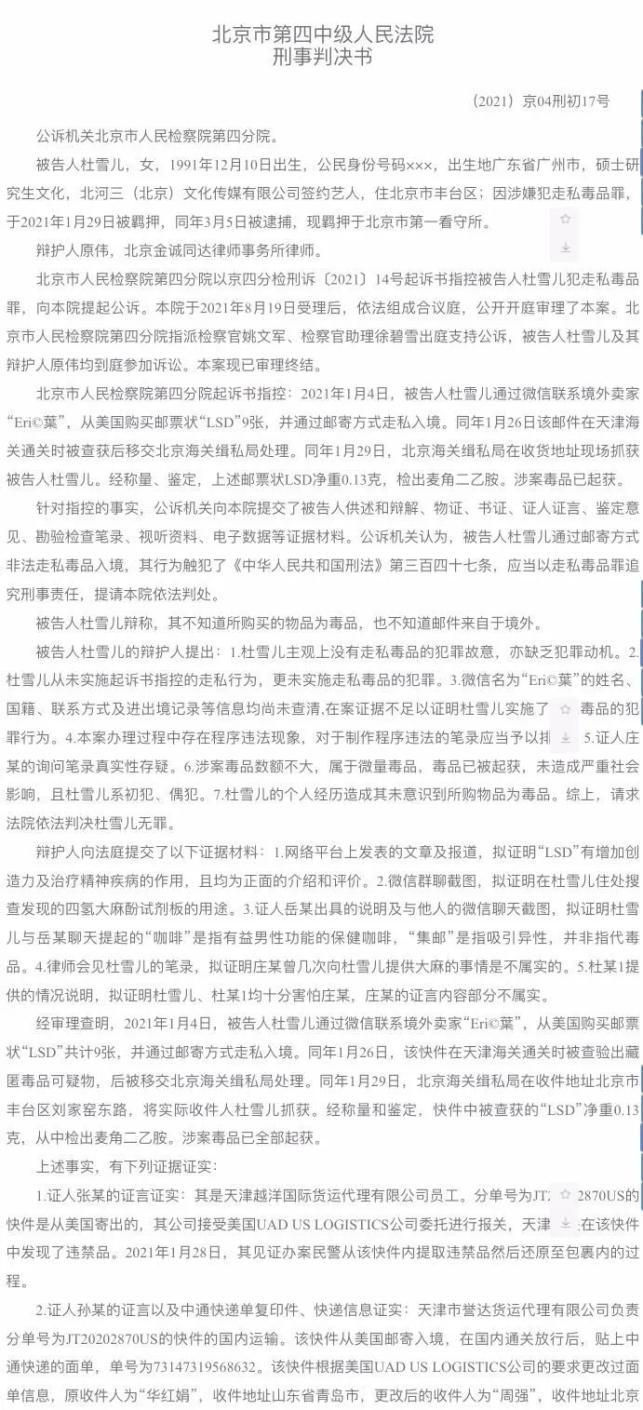 北京市第四中级人民法院刑事判决书显示:被告人杜雪儿为北河三(北京)文化传媒有限公司签约艺人。2021年1月4日,杜雪儿通过微信联系境外卖家“Eri@葉”,从美国购买邮票状“LSD”(麦角二乙胺,为一种强烈的半人工致幻剂)9张,并通过邮寄方式走私入境。2021年1月26日,该邮件在天津海关通关时被查获,后移交北京海关缉私局处理。2021年1月29日,杜雪儿在收货地址被北京海关缉私局抓获。经称量和鉴定,快件中被查获的“LSD”净重0.13克,涉案毒品已全部起获。