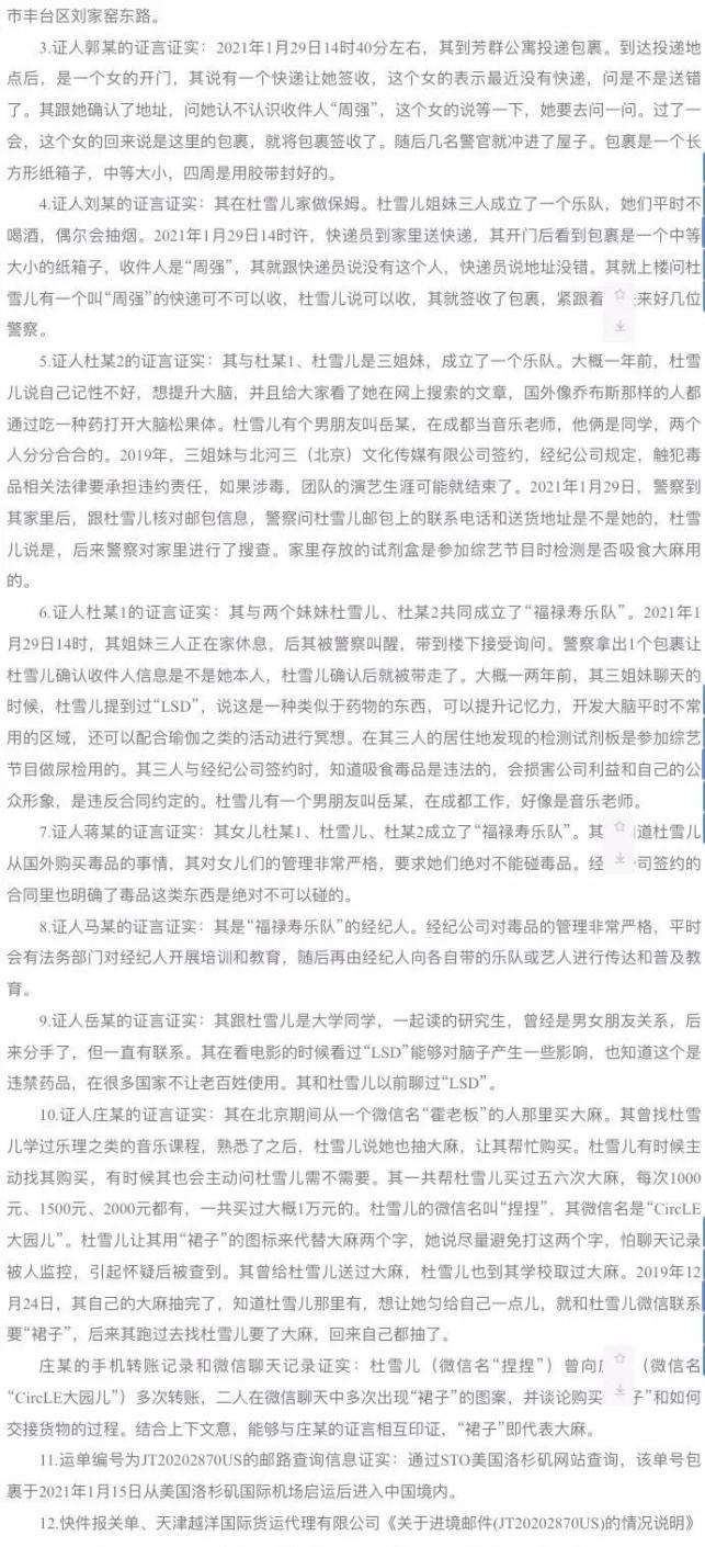 判决书显示,证人杜某1表示,其与两个妹妹杜雪儿、杜某2共同成立了“福禄寿乐队”。2021年1月29日14时,其姐妹三人正在家休息,后其被警察叫醒,带到楼下接受询问。警察拿出1个包裹让杜雪儿确认收件人信息是不是她本人,杜雪儿确认后就被带走了。