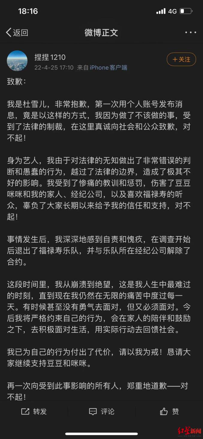 4月25日下午,杜雪儿用个人账号“捏捏1210”在微博道歉,她表示:“身为艺人,我由于对法律的无知做出了非常错误的判断和愚蠢的行为,越过了法律的边界,造成了极其不好的影响。我受到了惨痛的教训和惩罚,伤害了豆豆咪咪(福禄寿另外两位成员的昵称)和我的家人、经纪公司,以及喜欢福禄寿的听众,辜负了大家长期以来给予我的信任和支持,对不起!事情发生后,我深深地感到自责和愧疚,在调查开始后退出了福禄寿乐队,并与乐队所在经纪公司解除了合约。”