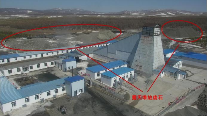 图2 2022年4月3日,督察组使用无人机拍摄发现,西北矿业公司露天堆放废石,未采取防雨、防扬尘、防流失措施