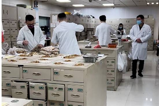 在中草药药房里,6张大大的配药长桌一字排开,配药、检查、补充,十来名工作人员忙得不可开交。