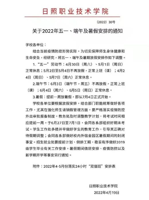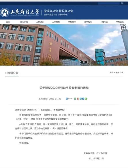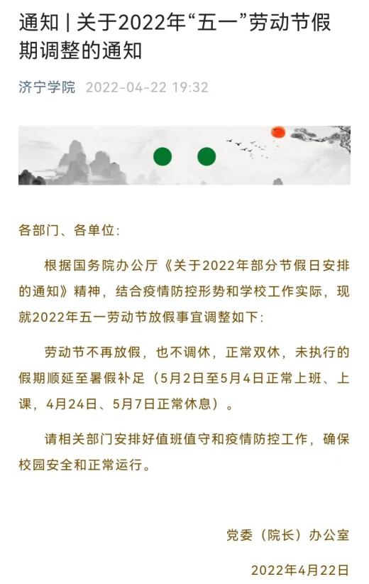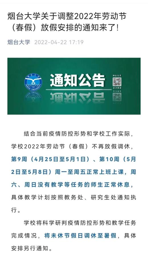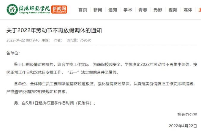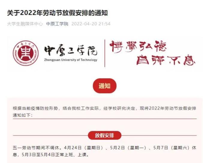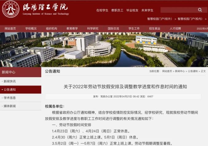 4月21日,中南林业科技大学发布《关于做好“五一”劳动节假期疫情防控工作的通知》。文中提到:4月22日至5月8日期间周一至周五正常上班、上课,周六、周日休息(具体教学安排由教务处、研究生院另行通知),“五一”劳动节法定节假日调整至暑假补休。