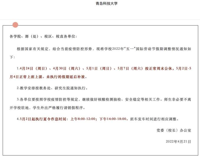 青岛科技大学明确,4月24日(周日)、4月30日(周六)、5月1日(周日)、5月7日(周六)按正常周末公休,5月2日-5月4日正常上班上课。未执行的假期延后补放。