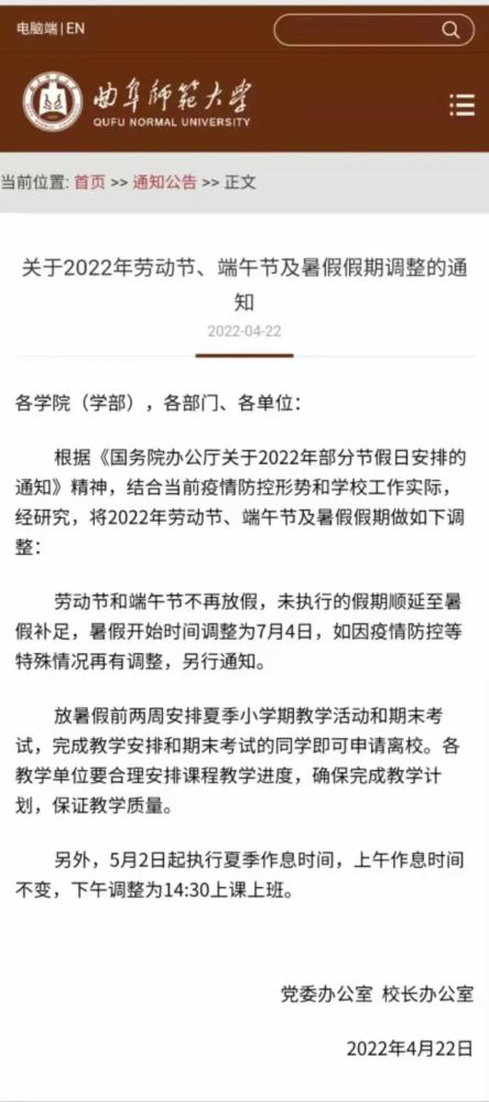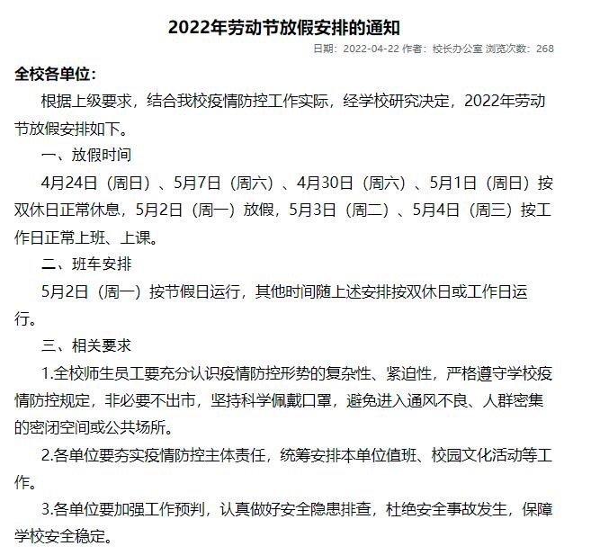 鉴于目前疫情防控形势,结合学校工作实际,为确保校园安全,学校决定2022年劳动节不再集中调休,按照正常工作日和双休日安排工作,“五一”法定假期合并至暑假。