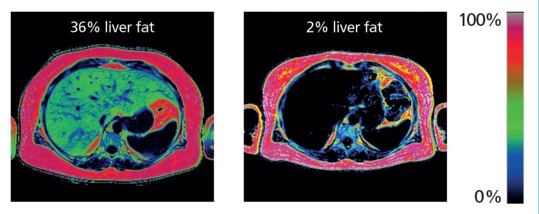 脂肪含量高(左),低热量饮食后脂肪含量大幅减少(右)[5]