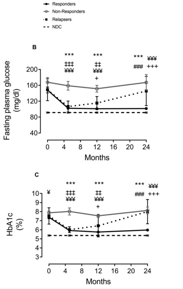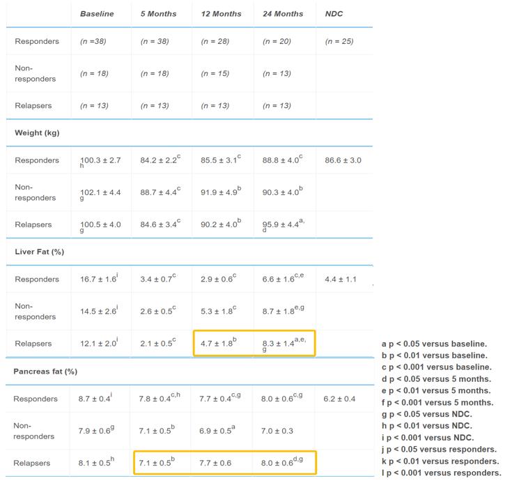 除了一开始就难以缓解的患者外,还有一部分患者从在12月后出现了复发(Relapser)。与持续缓解的患者相比,复发患者从试验第12月开始出现肝脏和胰腺的“复胖”(图6),而这一现象并未出现在持续缓解的患者中。