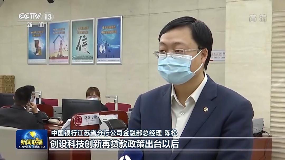 中国银行江苏省分行公司金融部总经理 陈松:(一般情况下)科技型企业贷款的利率是4.2%,创设科技创新再贷款政策出台以后,给科技型企业发放的贷款利率是3.5%。